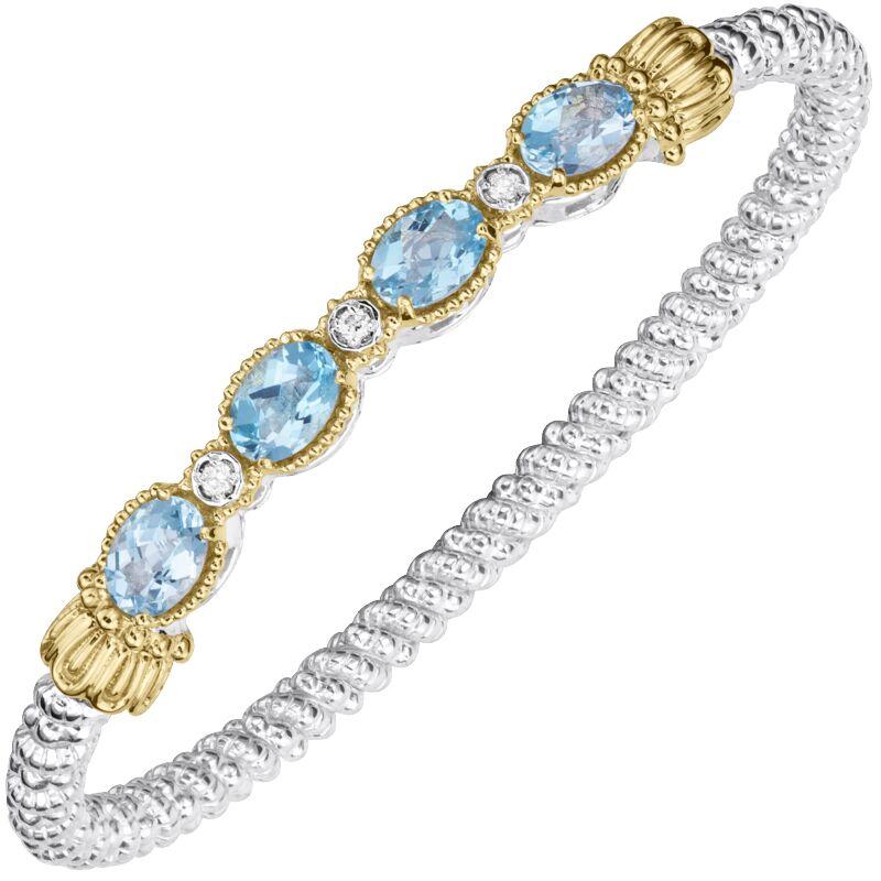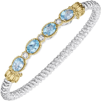 Adorned with the regal beauty of Sky Blue Topaz, this radiant stackable bangle shines with vibrant color and timeless elegance. Handcrafted in 14K gold and sterling silver, its refined design is accented by a graceful line of sparkling diamonds, a true expression of VAHAN’s signature luxury.