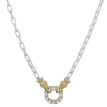 An open circle pendant blossoms with crown petals, artfully crafted in 14K gold and sterling silver. Brilliant diamonds add a luminous touch of elegance.