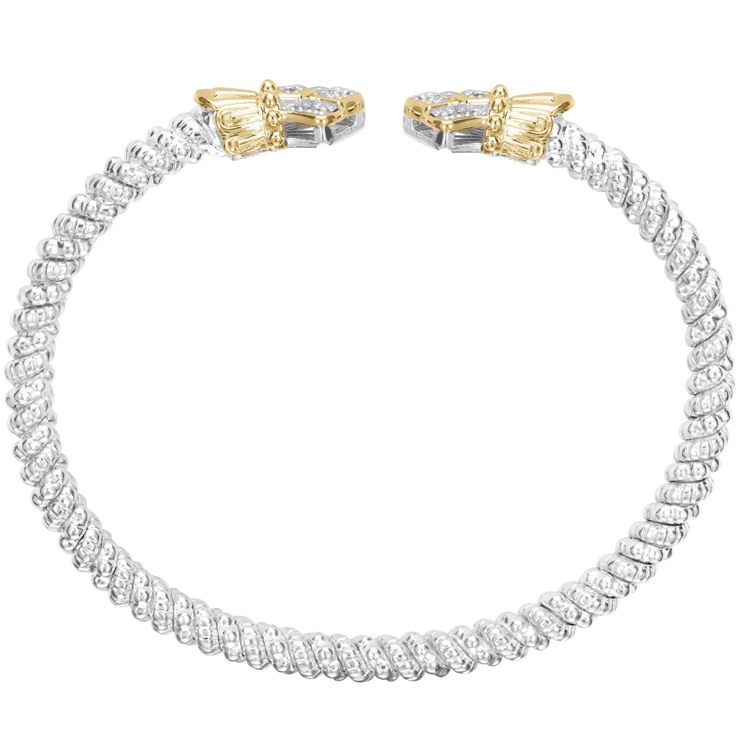 This signature stackable bracelet showcases an exquisite open silhouette, masterfully crafted from 14K gold and sterling silver. Brilliant diamonds and the intricate Moiré Beaded® texture infuse the piece with a sense of luxury, while regal crown accents enhance its sophistication.