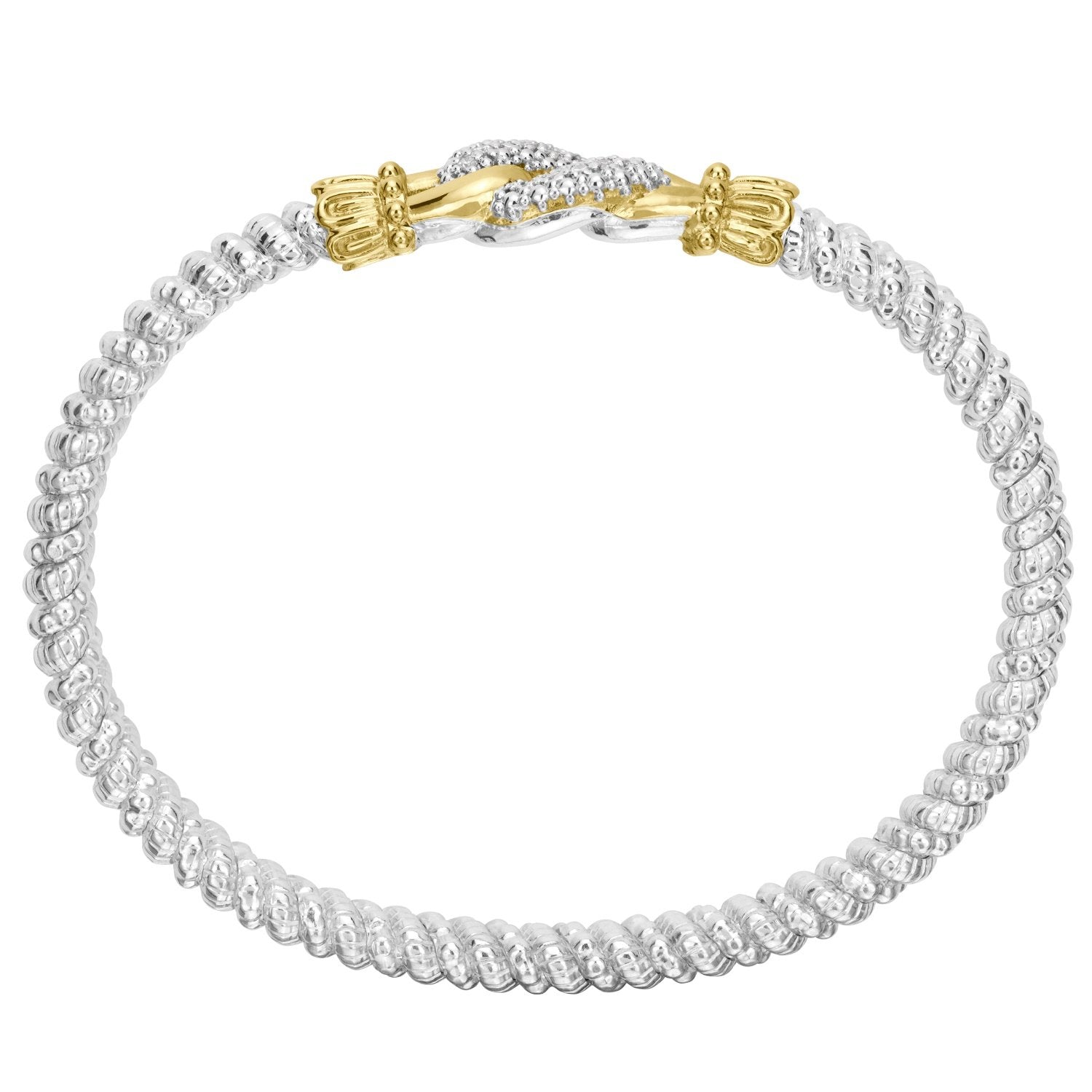 A timeless diamond interlaced link with a contemporary twist makes a statement on our stackable bangle bracelet. Designed in 14K gold, sterling silver and shimmering diamonds; it's accented by a regal crown motif.