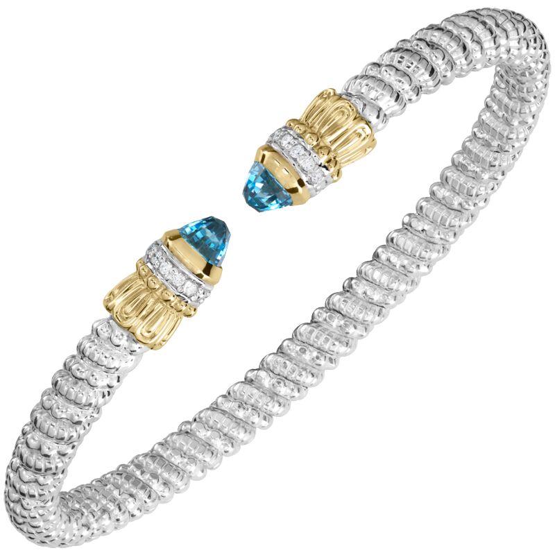 Featuring the signature Moiré Beaded® pattern, this open stackable bracelet brings rich texture and sparkle to the wrist. Crafted in 14K gold and sterling silver, it showcases luminous Blue Topaz, glittering diamonds, and regal crown accents for a refined finish, whether worn solo or layered with your favorite VAHAN styles.