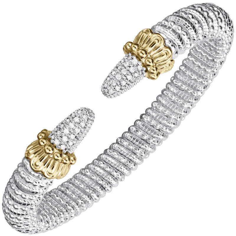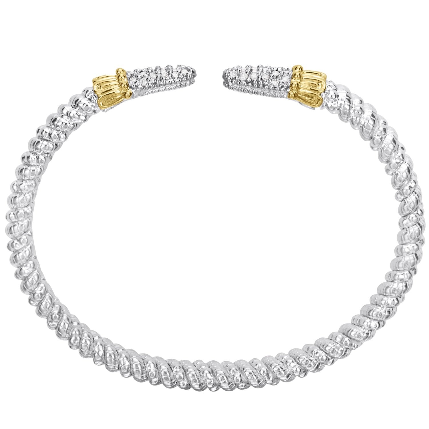 This elegant stackable bracelet features an open silhouette crafted from 14K gold and sterling silver. Dazzling diamonds enhance its sophistication, while the Moiré Beaded® design adds texture. Regal crown accents complete this versatile piece, perfect for layering or showcasing on its own.
