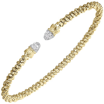 An open silhouette defines our sophisticated 2mm petite stackable bracelet, embellished by a Moiré Beaded® pattern. A 14K gold setting and dazzling diamonds further enhance the look. Pairs perfectly with additional VAHAN bracelets for a bold stacked statement.