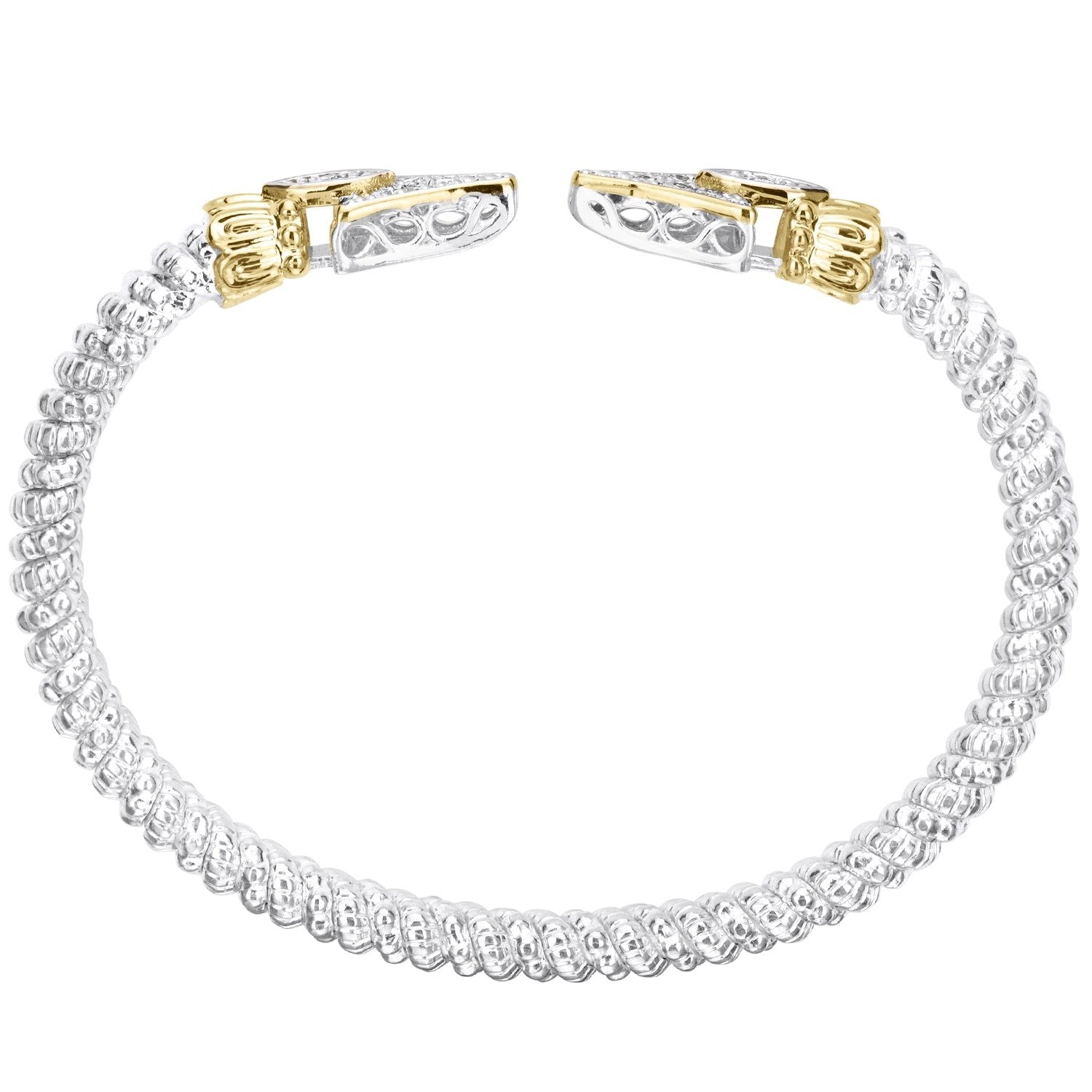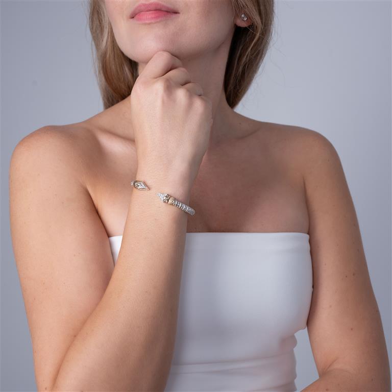 An arrow-inspired design sets apart our stackable open cuff bracelet, crafted in 14K gold and sterling silver. Illuminated by glittering diamonds and classic crown motifs, its Moiré Beaded® pattern brings a richly textured effect.
