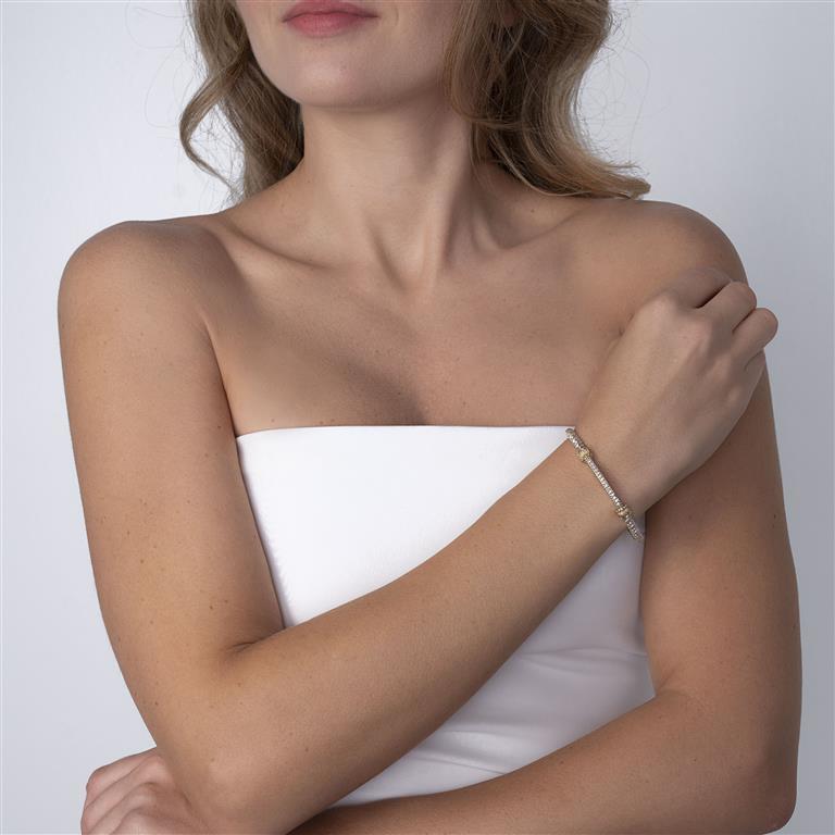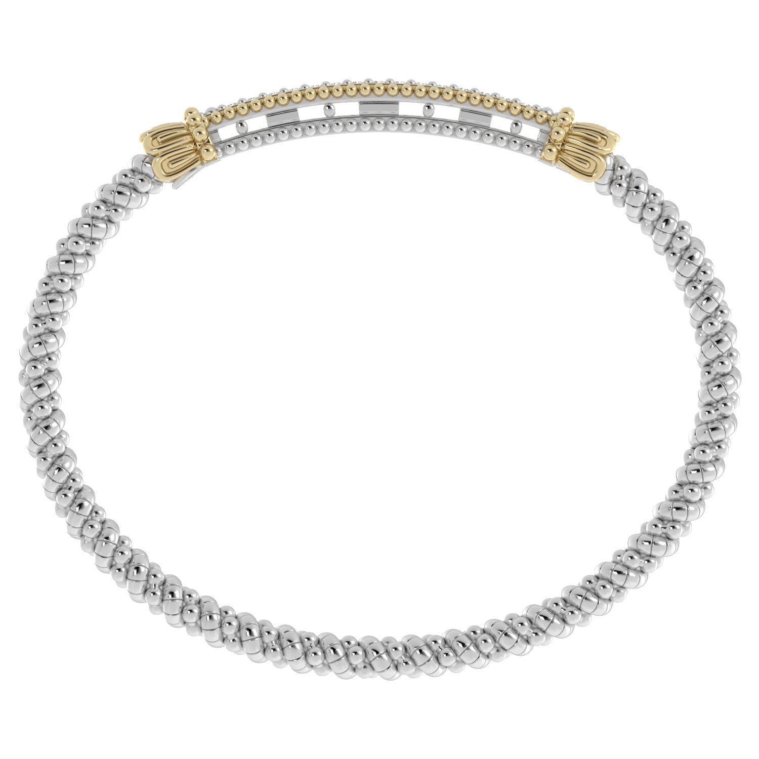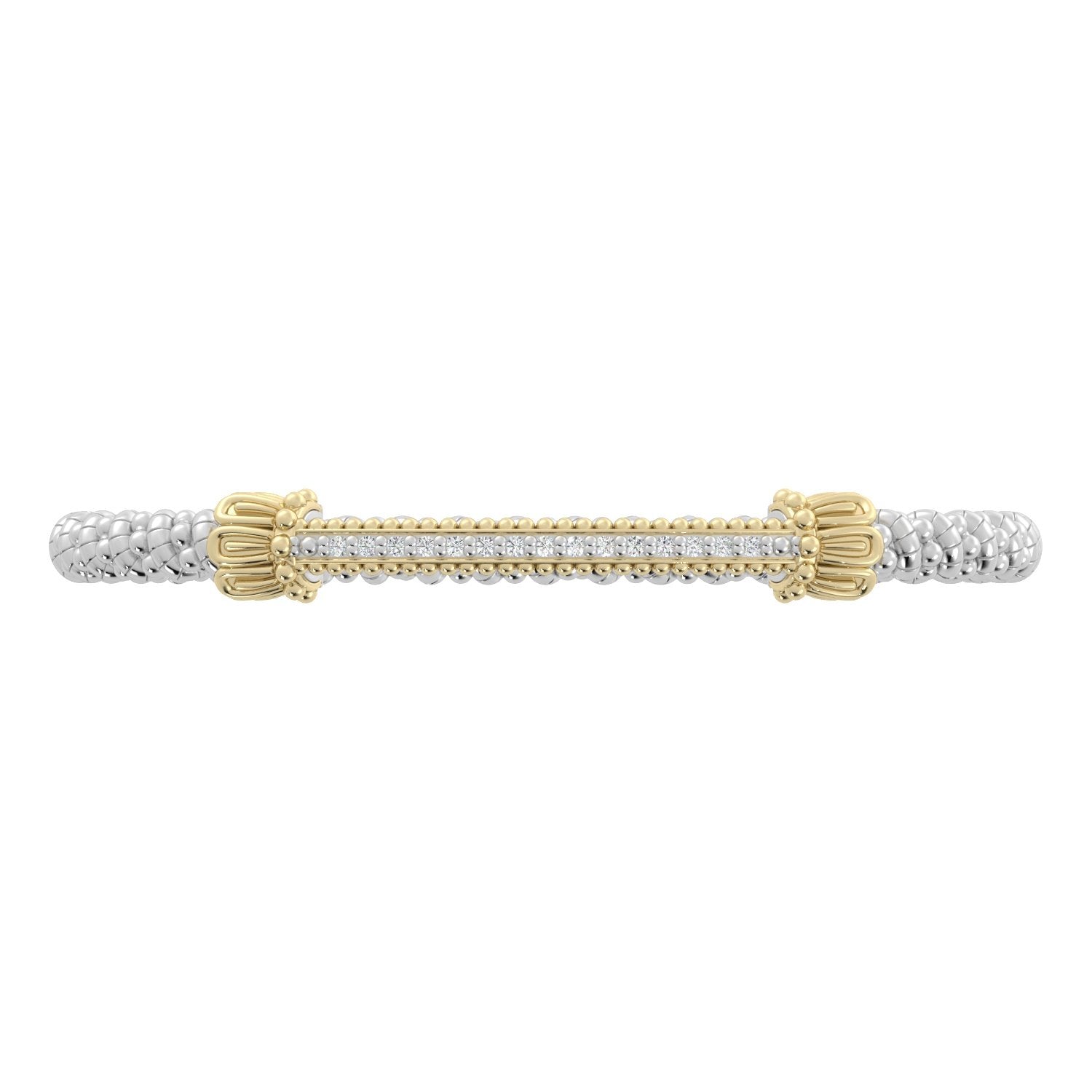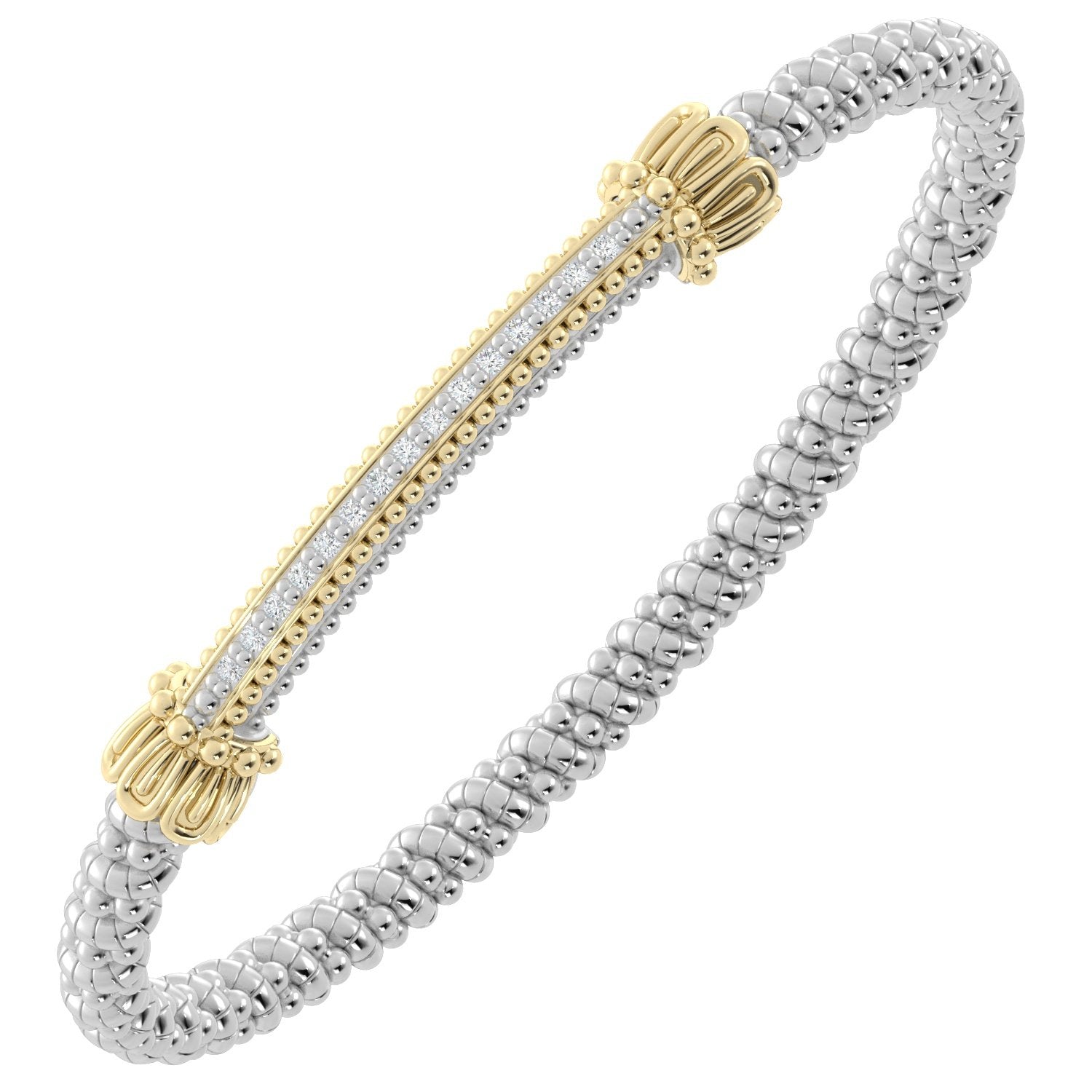 A sleek, sophisticated linear theme defines our versatile stackable bangle bracelet—equally chic for day or evening. Crafted in 14K gold and sterling silver, it's adorned with dazzling diamonds. The Moiré Beaded® pattern brings a richly textured effect.
