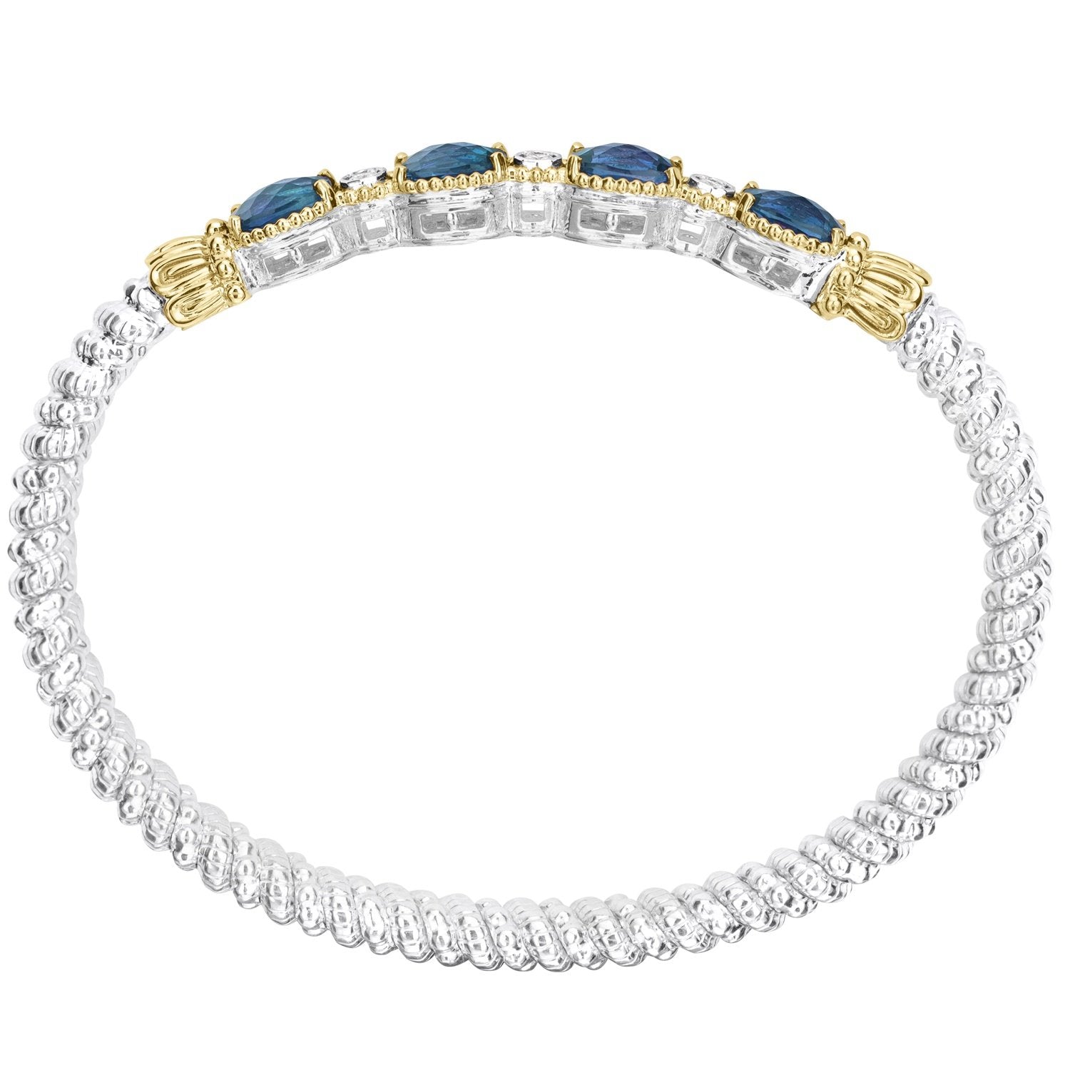 Adorned with the regal beauty of London Blue Topaz, this radiant stackable bangle shines with vibrant color and timeless elegance. Handcrafted in 14K gold and sterling silver, its refined design is accented by a graceful line of sparkling diamonds, a true expression of VAHAN’s signature luxury.