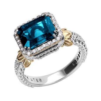 A captivating statement of color and sparkle. Brilliant diamonds frame a vivid London Blue Topaz in this sophisticated cocktail ring, crafted in radiant 14K gold and sterling silver. Bold yet elegant, it’s a standout piece beloved by VAHAN collectors for its timeless allure.