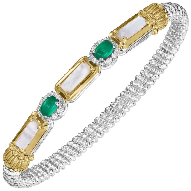14K Gold and Sterling Silver, Mother of Pearl, Green Onyx and Diamond Stackable Bracelet | 4MM