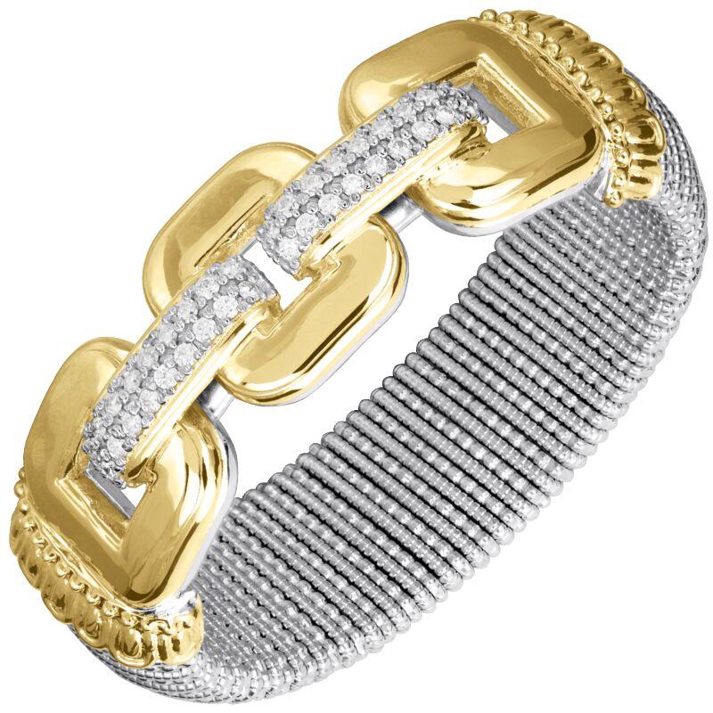 Brilliant diamonds illuminate this link design cuff bracelet, elevated with signature crown motifs and VAHAN’s Moiré Beaded® pattern in 14K gold and sterling silver.