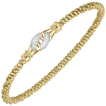 A timeless diamond interlaced link with a contemporary twist makes a statement on our stackable bangle bracelet. Designed in 14K gold and shimmering diamonds; it's accented by a regal crown motif.