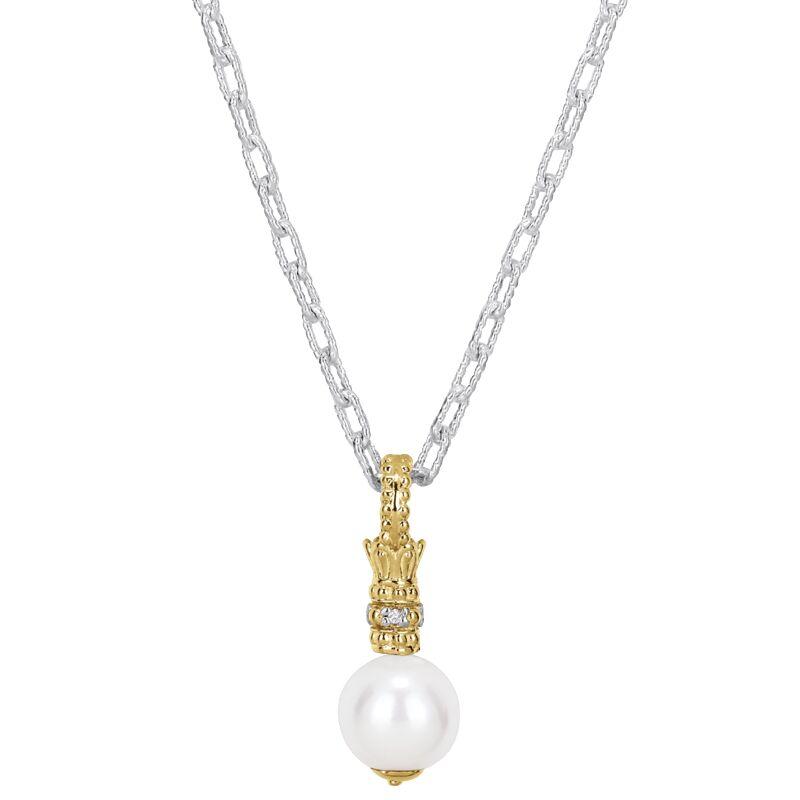 14K Gold and Sterling Silver, White Pearl and Diamond Necklace