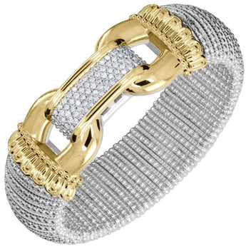 This 14K Gold and Sterling Silver Diamond Stackable Bracelet shines with timeless elegance. Featuring VAHAN’s intricate signature design, crown accents, and Moiré Beaded® pattern, it is a beloved piece that radiates sophistication on its own or in a stack.