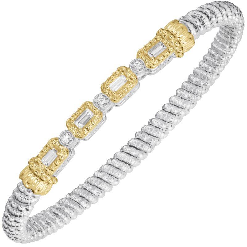 Timeless elegance meets modern brilliance in this 14K Gold and Sterling Silver stackable bangle, illuminated by glittering diamonds and elevated by VAHAN’s signature crown accents and Moiré Beaded® pattern.