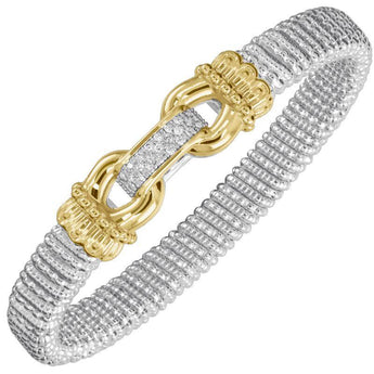 This 14K Gold and Sterling Silver Diamond Stackable Bracelet shines with timeless elegance. Featuring VAHAN’s intricate signature design, crown accents, and Moiré Beaded® pattern, it is a beloved piece that radiates sophistication on its own or in a stack.
