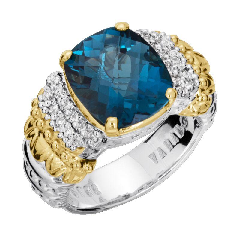 14K Gold and Sterling Silver, London Blue Topaz and Diamond Ring