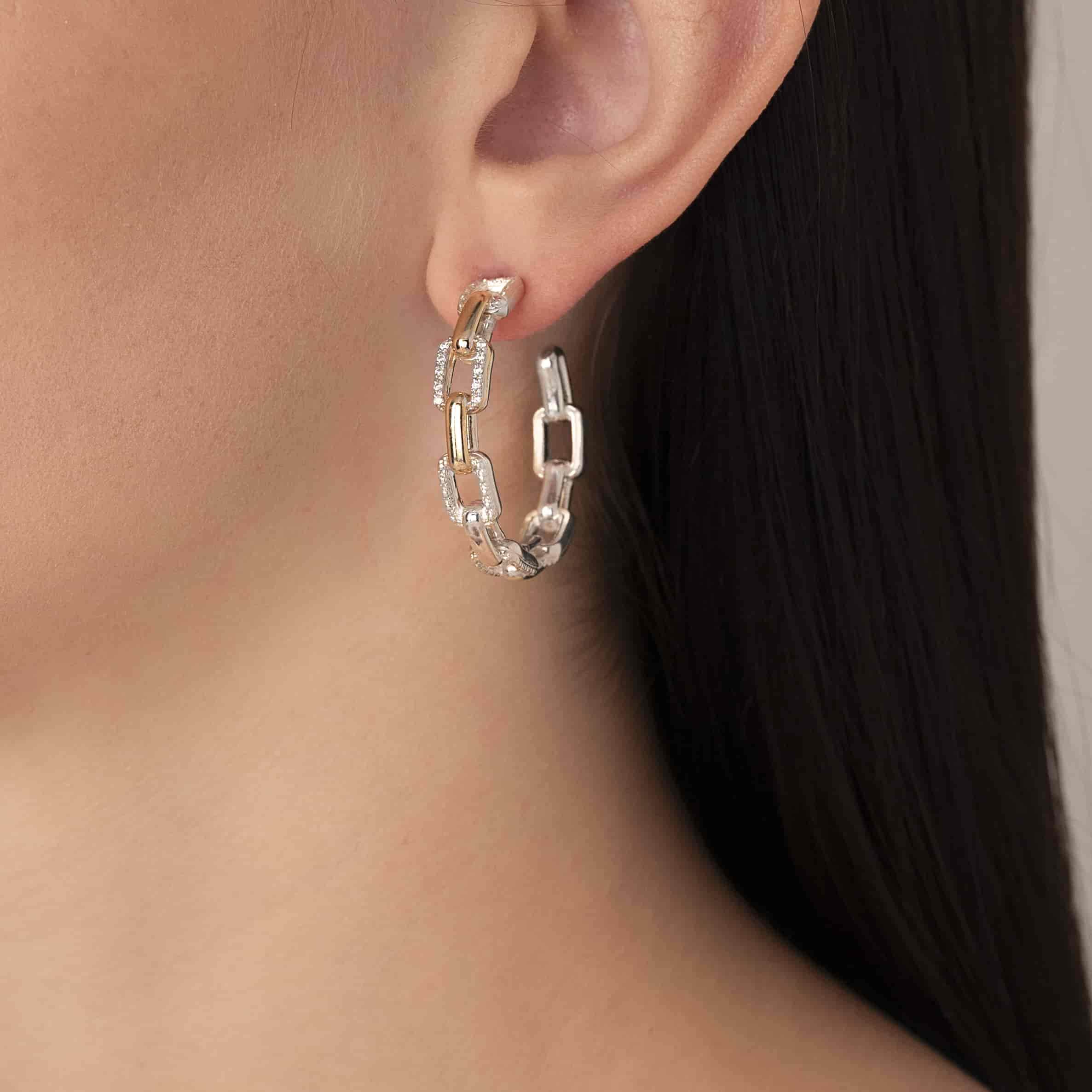 Haute hoops: Glittering diamonds accent these stunning earrings, designed with a timeless link motif. Crafted in 14K gold and sterling silver, they are finished with VAHAN’s signature detailing for a polished, sophisticated look