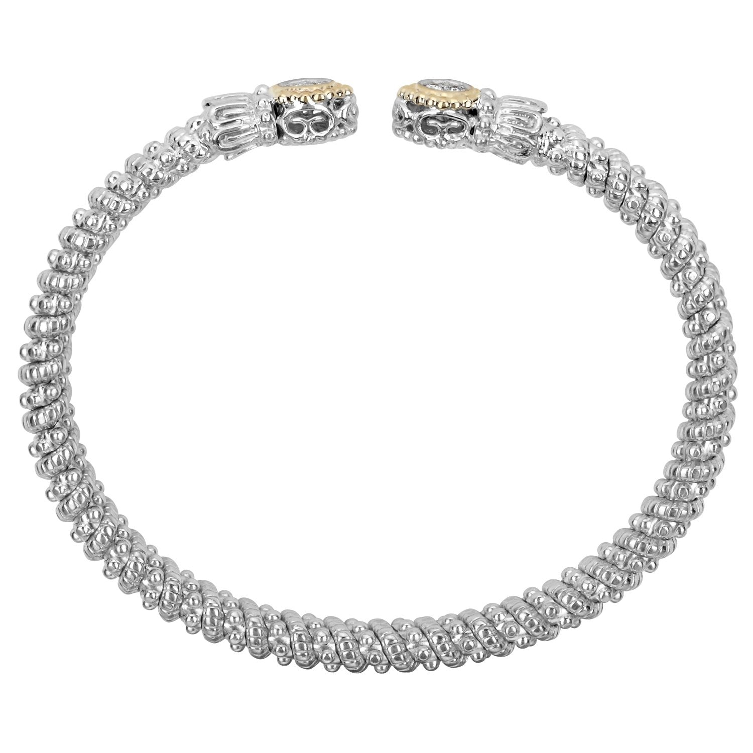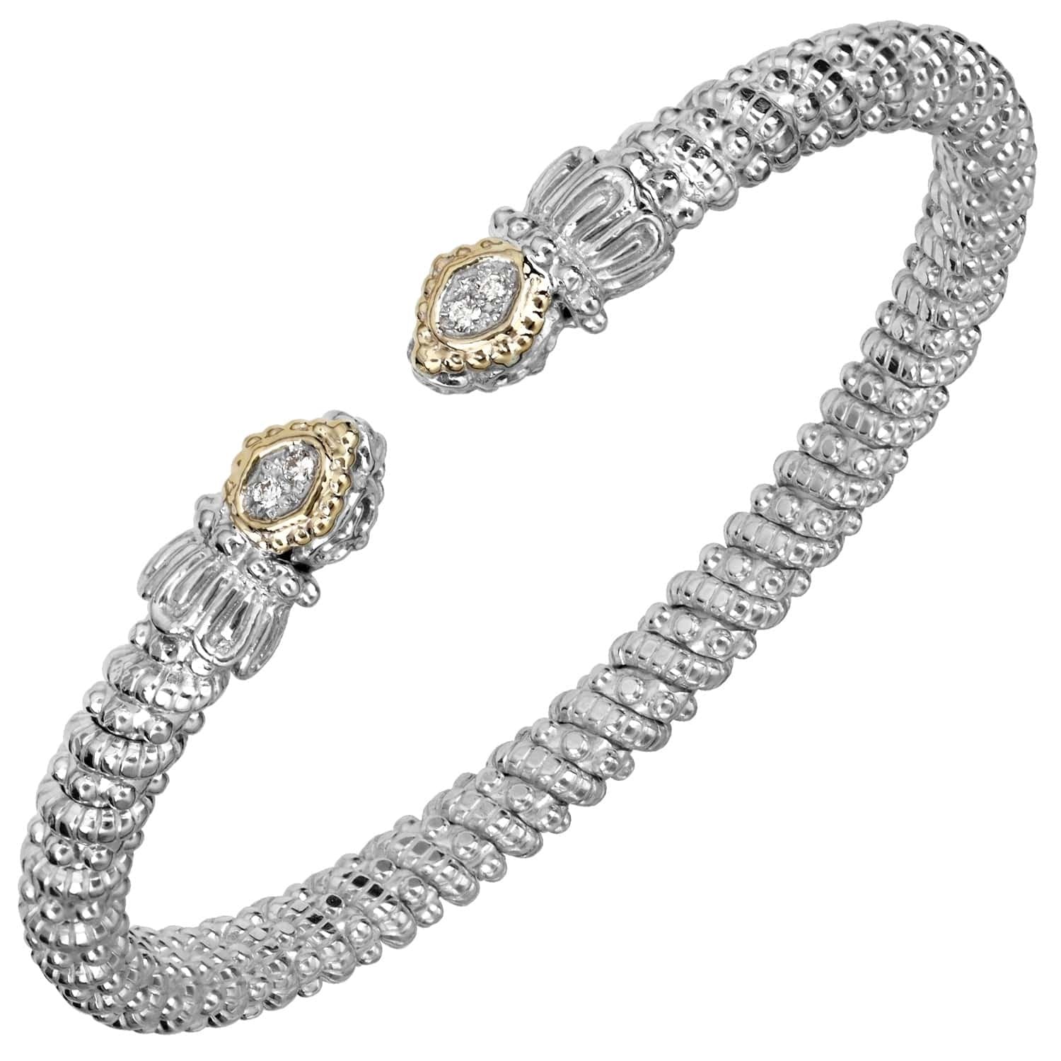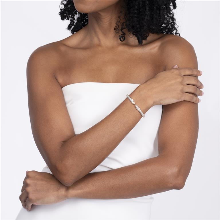 This signature bracelet showcases an exquisite open silhouette, expertly crafted from 14K gold and sterling silver. Dazzling diamonds enhance its elegance, while the intricate Moiré Beaded® design adds a touch of luxury. With regal crown accents, this bracelet stands out as a stunning statement piece that pairs beautifully with any VAHAN collection.