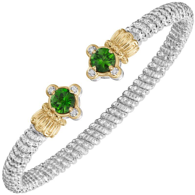 This 14K Gold and Sterling Silver Chrome Diopside and Diamond Stackable Cuff Bracelet showcases vibrant green gemstones and sparkling diamonds, finished with VAHAN’s signature Moiré Beaded® pattern and crown accents. Perfect stacked or stunning on its own.