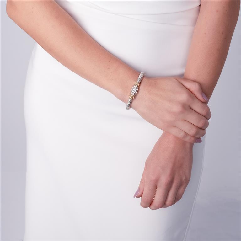 Dazzling from day to night: Diamonds impart a scintillating effect on our stackable bangle bracelet, accented by geometric and crown motifs. Crafted in 14K gold and sterling silver, a Moiré Beaded® design distinguishes the look with textural detailing.