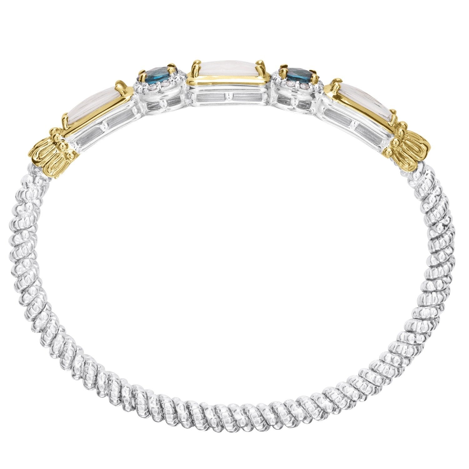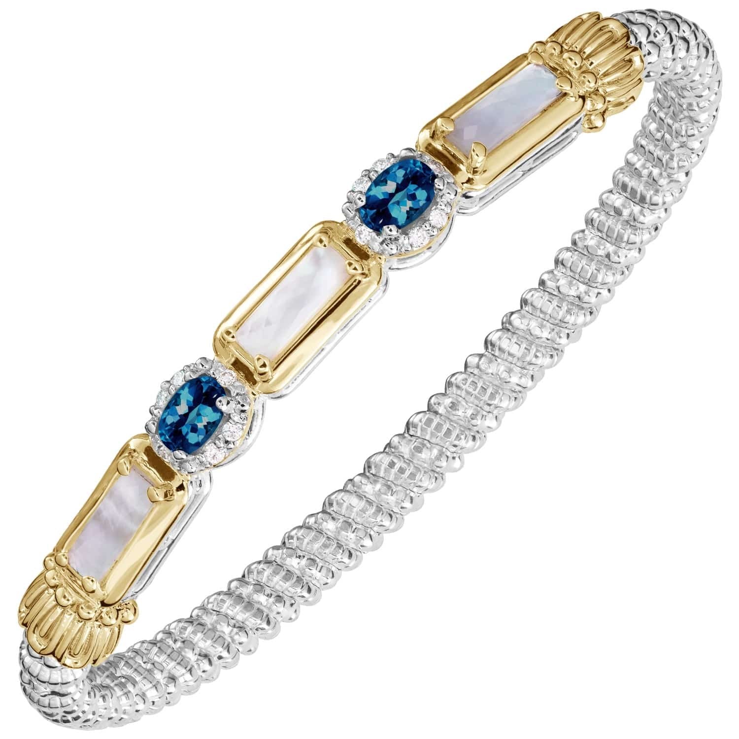 14K Gold and Sterling Silver, Mother of Pearl, London Blue Topaz and Diamond Stackable Bracelet | 4MM
