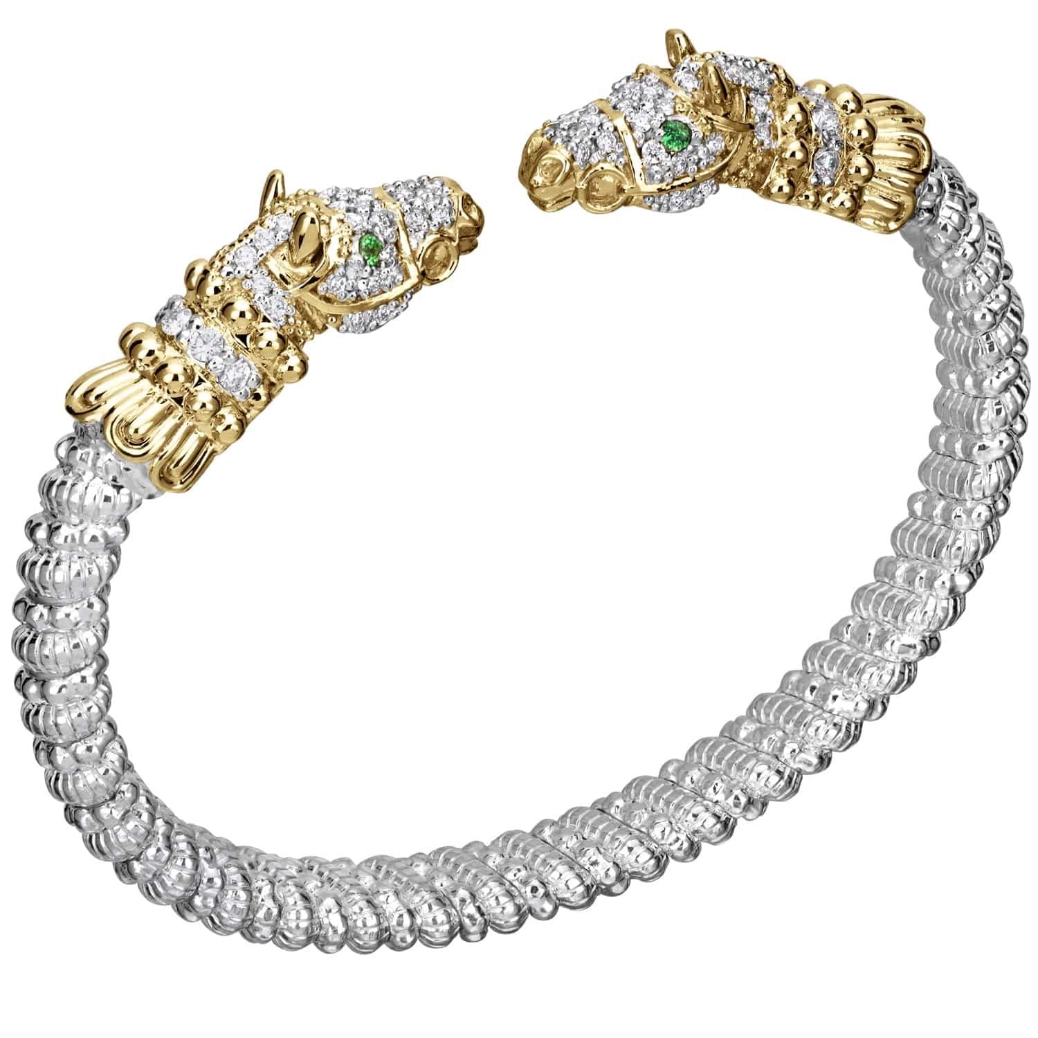 14K Gold and Sterling Silver, Tsavorite Garnet and Diamond, Equine Stackable Cuff Bracelet | 6MM